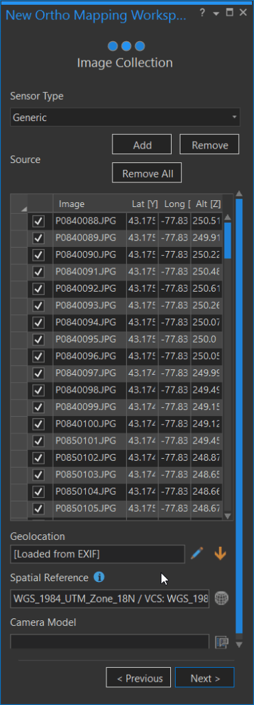 Here I found an issue because the Anafi is not in the camera database. So I had to do some digging around along with trial and error to find how to create my own camera calibration file. To figure it out, I used the EXIF data to get the focal length, which is not the same as the 35mm equivalent focal length in the EXIF. For the Anafi, the focal length is 4 mm and the pixel size is 1.12um or 0.00112mm. You can keep the other parameters the same. I saved a copy of the camera file to use later. (In ArcGIS Pro 2.8 the Anafi camera parameters are now included and have a 16 and 21 megapixel option, I normally use the 21mp).