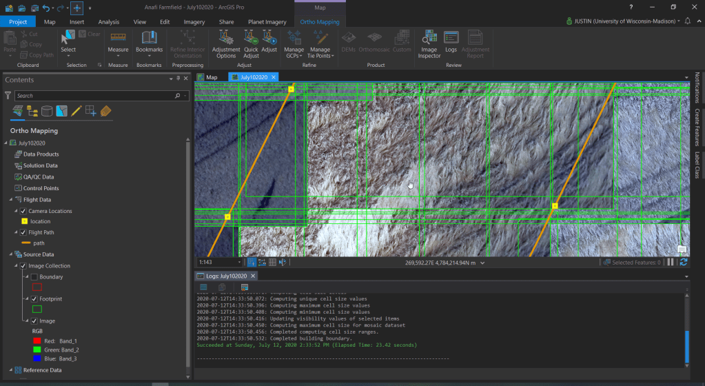 I did leave out one important part and that is ground control points. To get more accuracy positional accuracy, use ground control points. In the Orthomapper Workspace, there are tools that can help you with is. During our collection, we did not take points because our main concern was to just capture some test imagery. In future collections, we will be adding this to our field collection workflow.