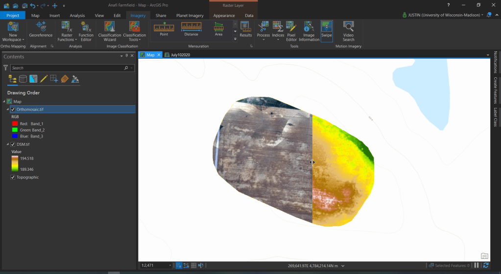 Then because I wanted to have all of the data in a project geodatabase, I exported the dem and orthomosaic. With the data in your preferred format, you can do any of the different analyses or appearance tools that you have available to you.
