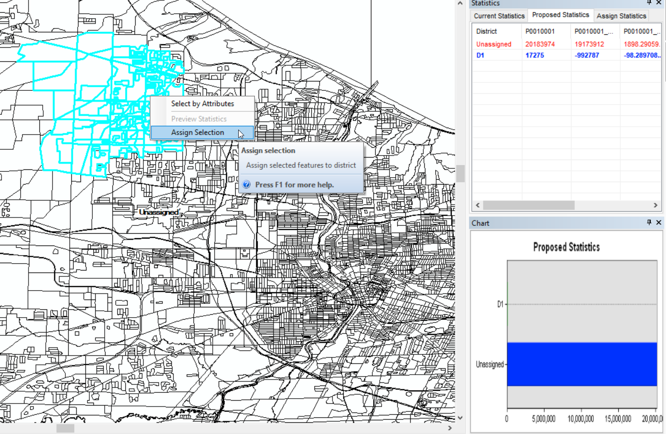 10. Now you can use the select tool and start selecting blocks to add to a district. When you add them right click and then Click Assign Selection to add them to the district. As you work you will see the statistics changing and the graph updating. For the most part, the goal of districting is to have equal populations and the graph will give you a good representation as you work.
