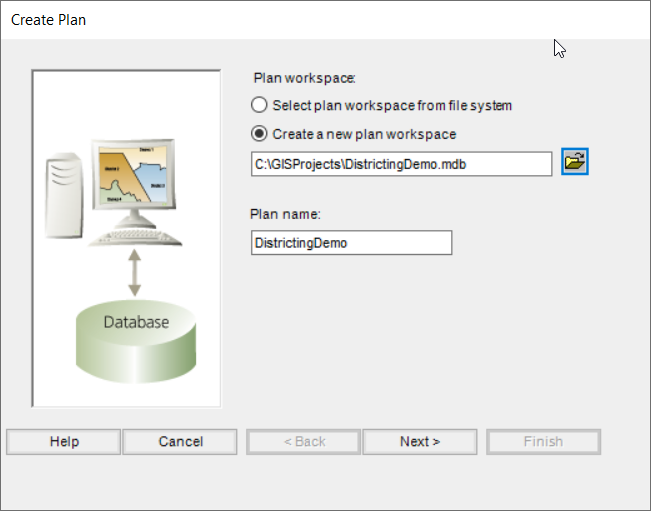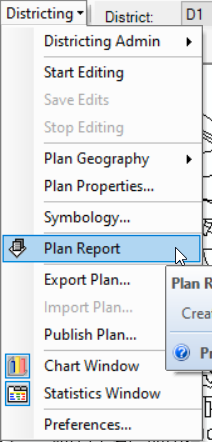 - In the Districting Tool Bar click Districting -> Districting Admin -> Create New Plan