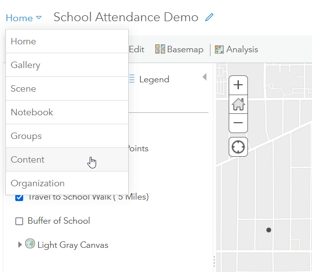 - To get to the feature service, click on the top of the map and go to Content.