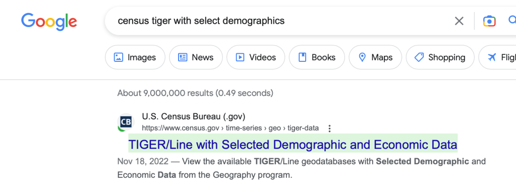 Let’s first go in and get our data. A quick way to find this data is to use your favorite search engine and search for census tiger with selected demographic. The first result should be the link to the data. I end up using this method because a lot of the time the census website changes the location or method to find this page.
