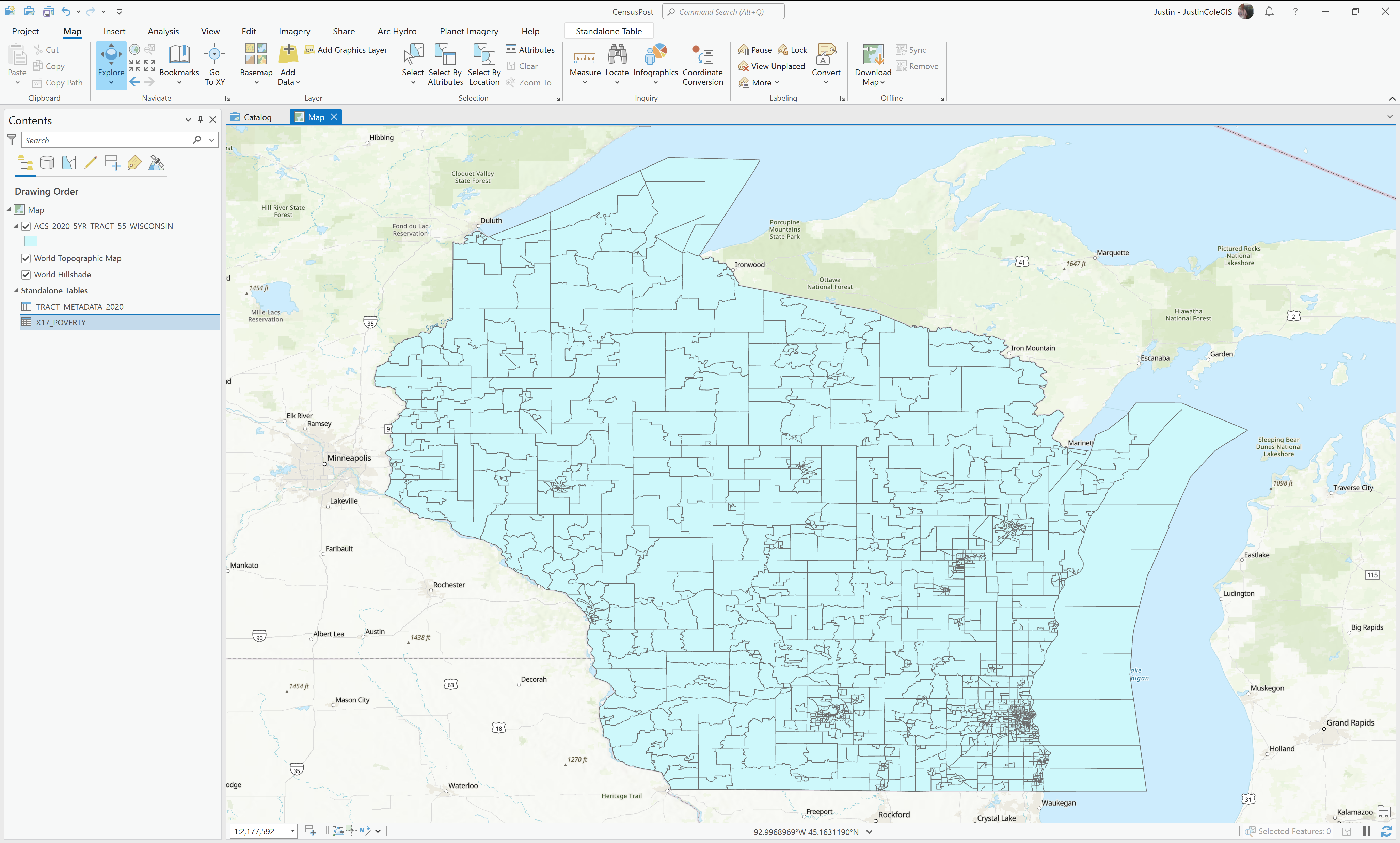 So now let us change the focus from just exploring the data to making a thematic map that has good meaning. Add in the feature class, metadata table, and one table of your choosing (I am going to use Poverty).