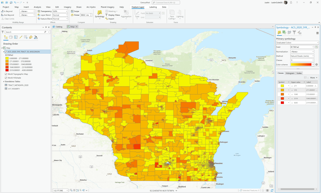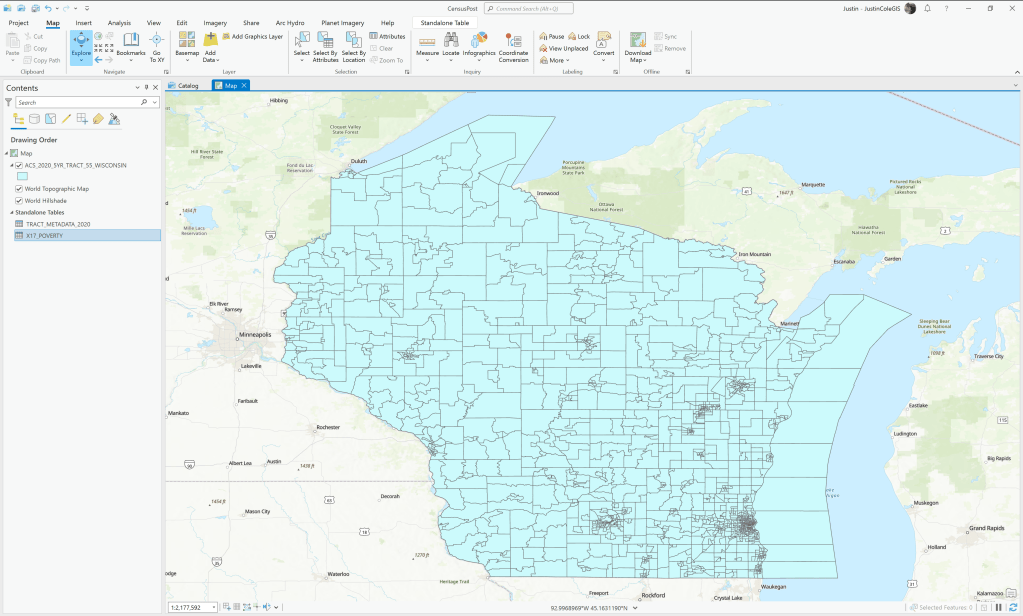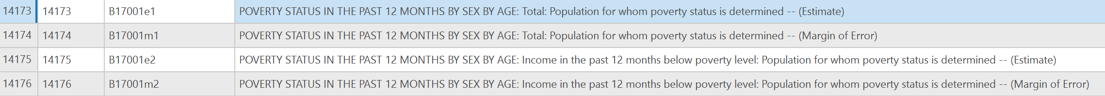 In these attributes you will find a ton of data (just over 36.000 of them), just read the full names very carefully when picking the ones to display. The first one may not be the one that you want. For example POVERTY STATUS IN THE PAST 12 MONTHS BY SEX BY AGE: Total: Population for whom poverty status is determined — (Estimate) is not the number of people in poverty, but the total population. That field is the next one POVERTY STATUS IN THE PAST 12 MONTHS BY SEX BY AGE: Income in the past 12 months below poverty level: Population for whom poverty status is determined — (Estimate). If you want a poverty rate for each census tract, you will need to combine them and that is why it is set up that way and we will cover more on that in Part 2.