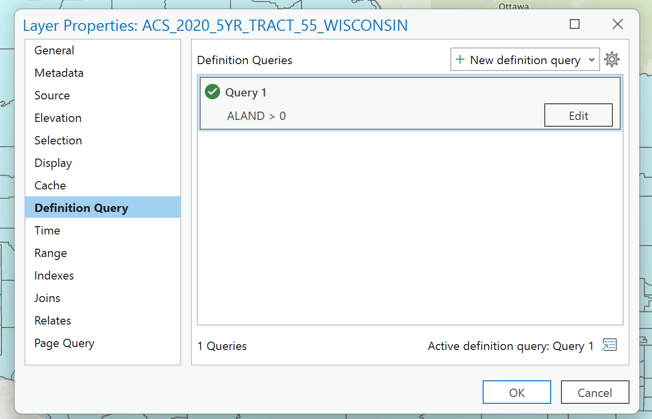 The first thing I like to do is to run a Definition Query to remove the tracts that are in the water since no one lives there. Just right-click on the feature class and go to properties. Click on the definition query tab and then set the query to ALAND > 0. This will filter out the water, but it is still a part of the data.