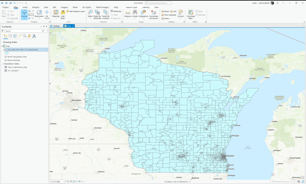 For this example, I am going to look at the Census Tracts for Wisconsin. Because the data are nationwide the steps will translate for all states and Census geographies, but what will change is the amount of attributes available. The Census Tracts have a great number of uses and will have tens of thousands of attributes to work with. The hardest part is to find the ones that allow you to tell the story that you want to tell.
