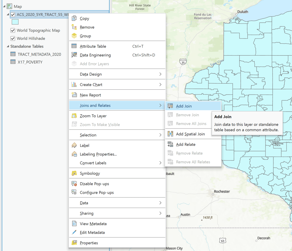 Now let us join the Census tract feature class to our table. Right Click the feature class and then go to Joins and Relates -> Add Join.