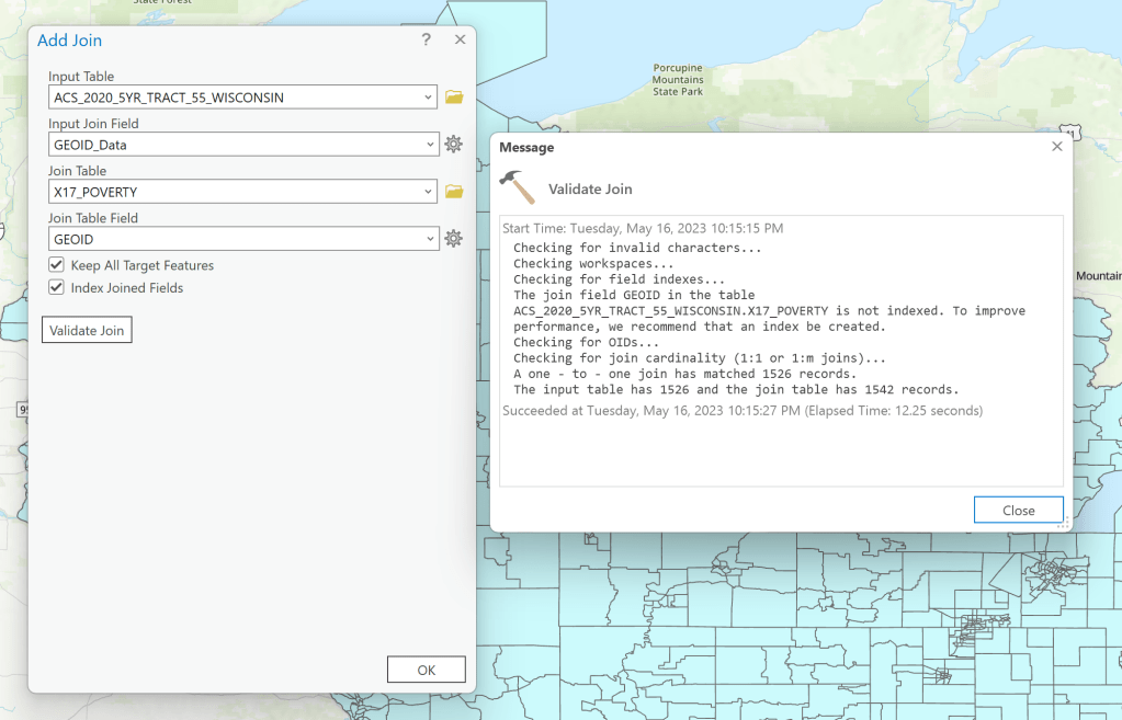 Your Input Table should be set to your Tract Feature Class and then your Join Table should be your Supplement Table (X17_Poverty in my example). Our two fields that match are GEOID_Data from the Input Table and GEOID from the Join Table. Because these tables are so large I would suggest indexing the Joined Fields. It is also good practice to always validate the join to make sure it will work. As long as you have a close match (we are filtering and that is why we do not have a 100% match) our join will work. And now click ok to join.