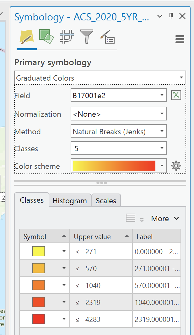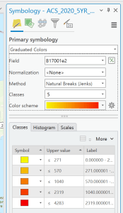 Once it is joined we can do some basic symbology to show the number of people in poverty. To do this, just go to the symbology and use a graduated color schema. Remember to pick the correct field as it will default to ALAND.