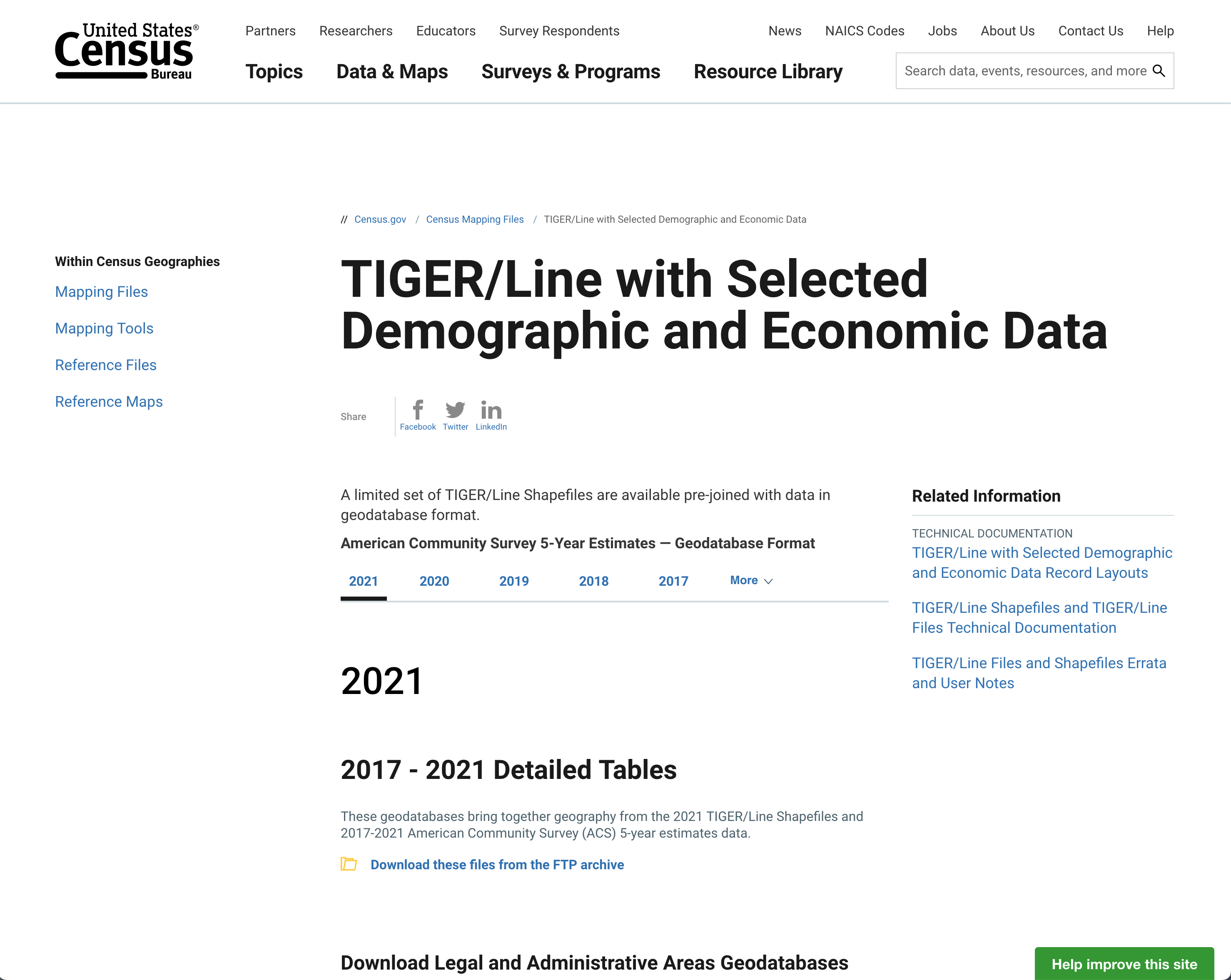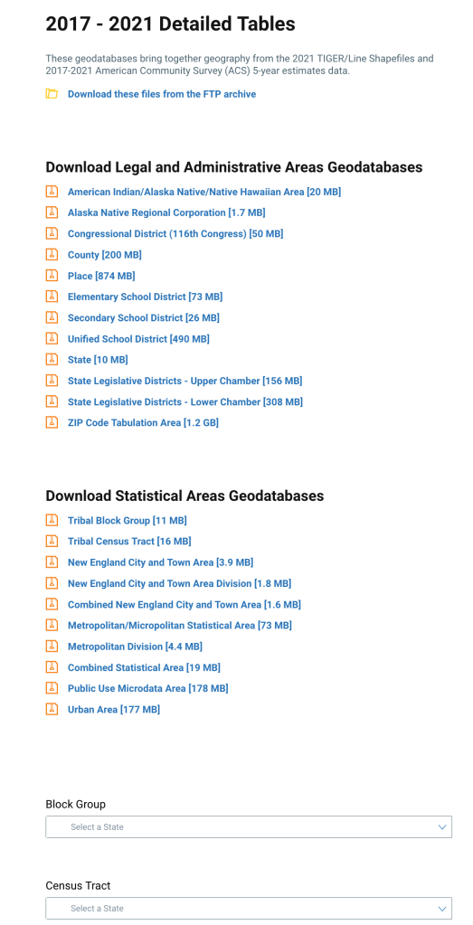 Once you are on the page you will be given a lot of options to download. The first option is the date of the data. The data included in these geodatabases are what the Census Bureau calls the long-form census or American Community Survey 5-Year Estimates. What this means it is a tally of 5 years of the American Community Surveys and are estimates based on statistical calculations from those surveys. Because of the 5 year nature of the surveys, you will see multiple years and the different years may include different attributes behind them. So your first decision is what year’s worth of data to look at.