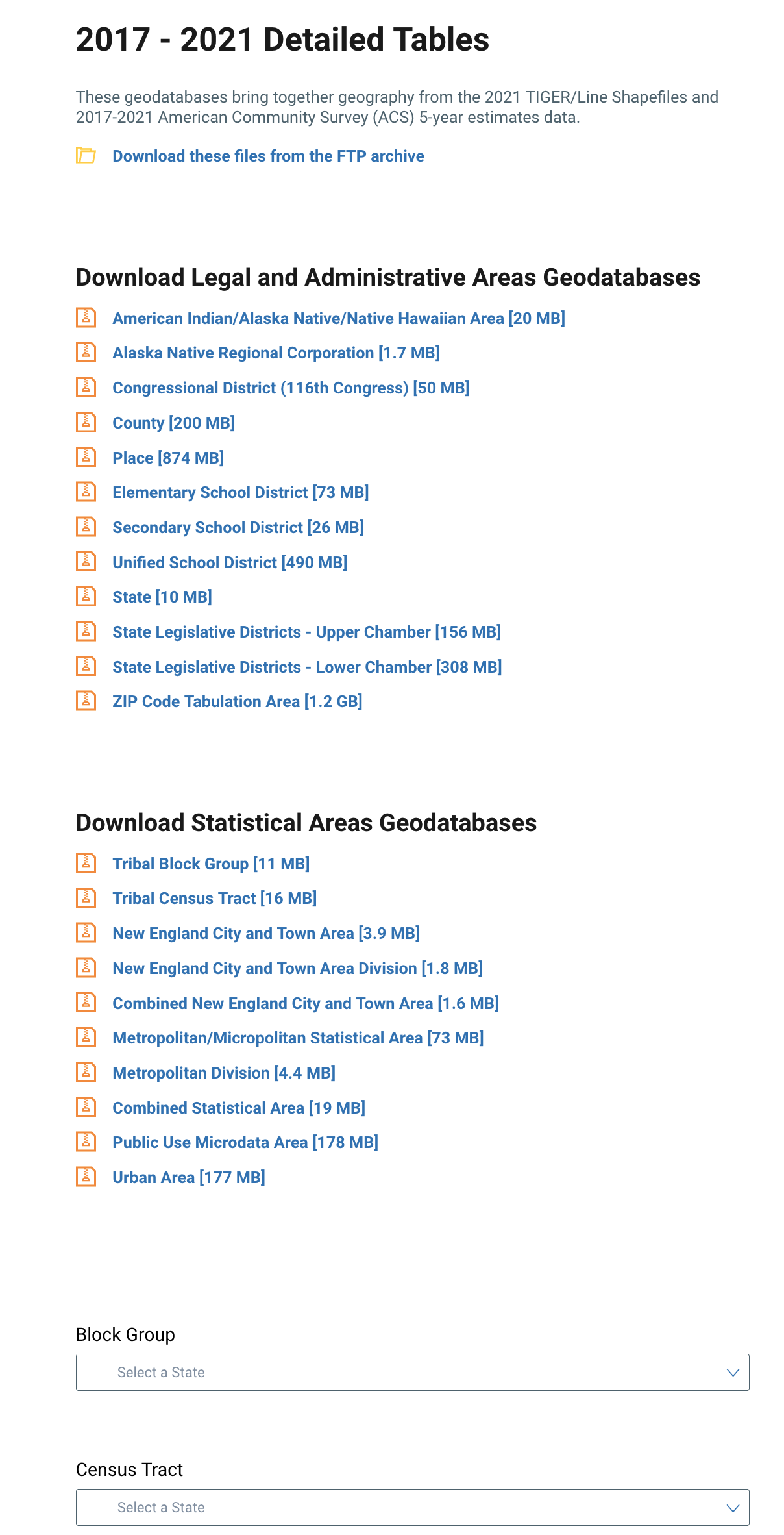 For any layer other than the Tracts, Block Groups, and County Subdivisions there is only one download link. For the Tracts and Block Groups you will need to download the data using the dropdown to select the state.