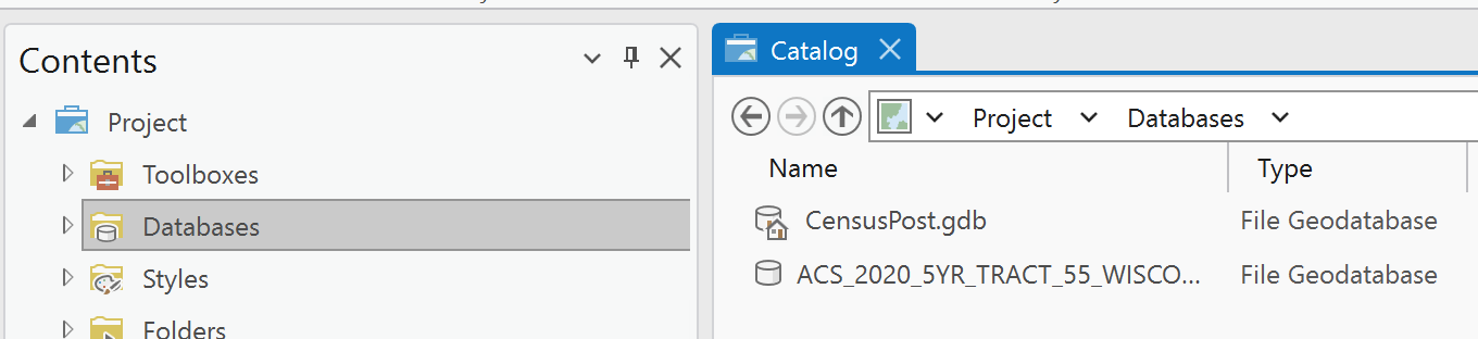 Once you download and unzip the data you will see a folder with a .GDB name. If you have that folder inside another folder with a .GDB, I would recommend moving it out so there is only one level of .GDB to prevent any read issues that you might encounter. After you have the folder all set open your favorite GIS software that can read file geodatabases. I will use ArcGIS Pro, but for Part 1, you can use QGIS and ArcMap the same way to read and join the tables.
