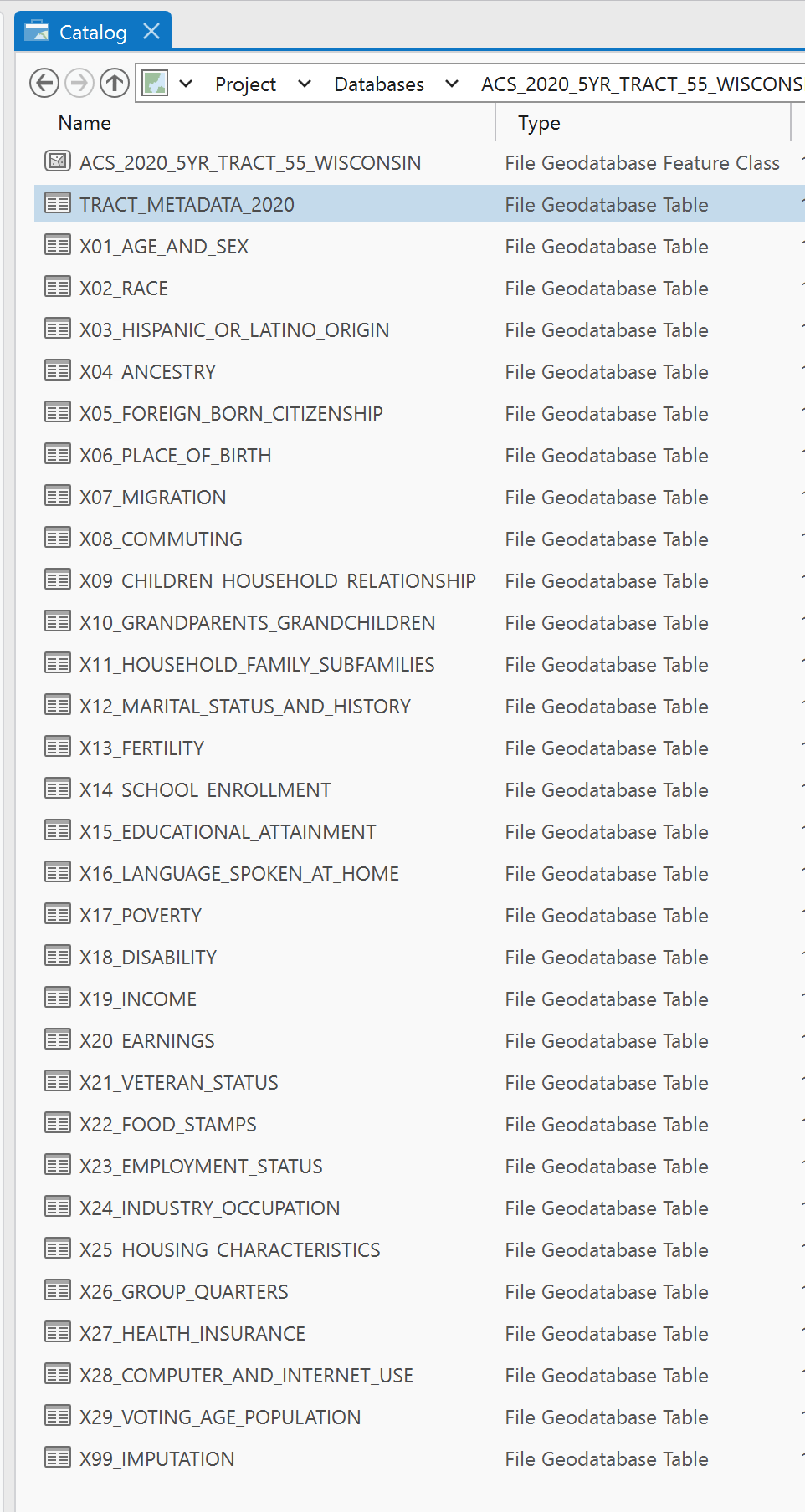 Now that the database is connected we can open it and see the structure. You will see one Feature Class and then 31 tables. The Tract Metadata table is the same one as the documentation link from the Census page and is your key to understanding the other tables. If you downloaded a different geometry, the metadata will still be there, it will just reflect your new geometry.