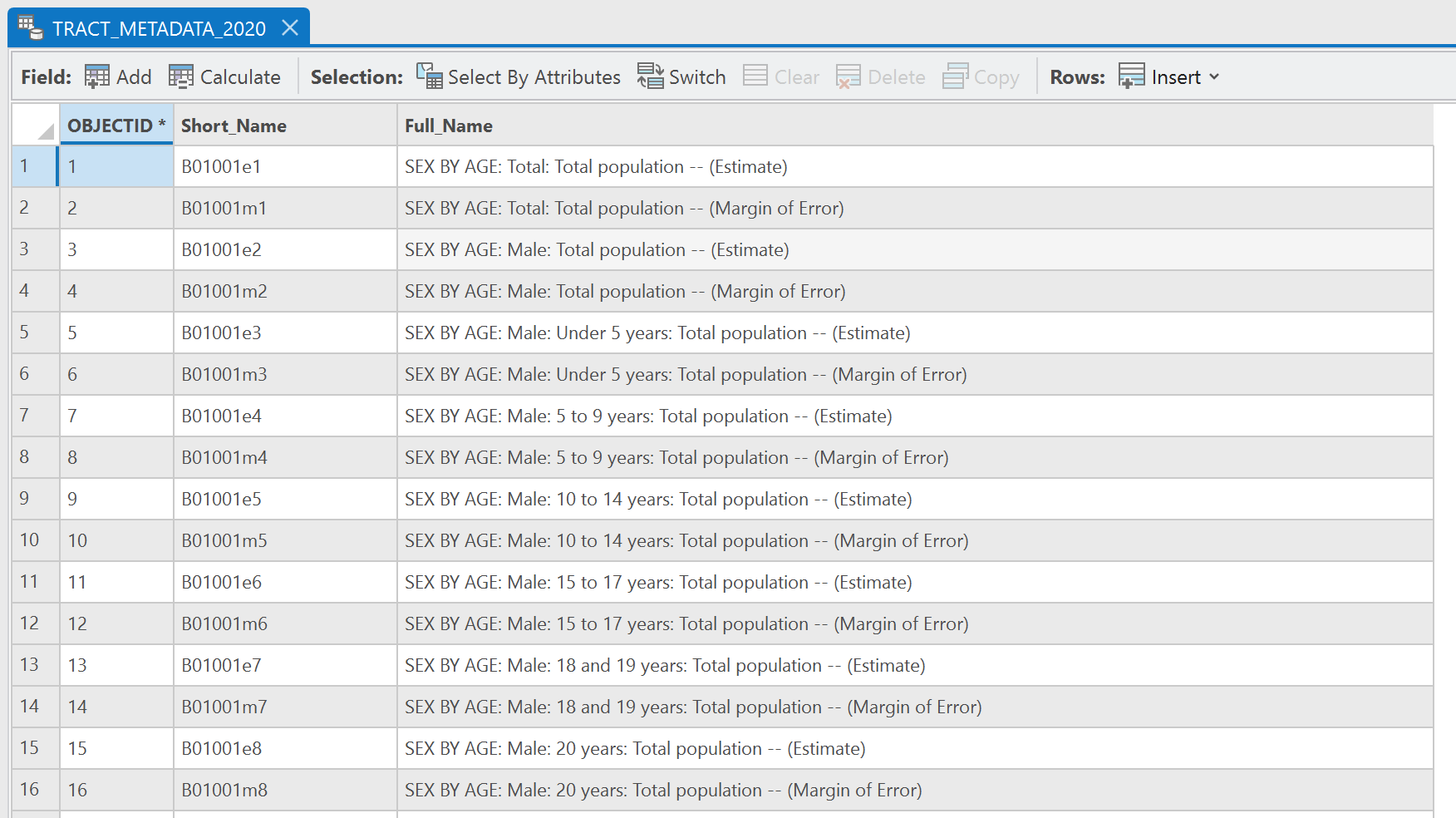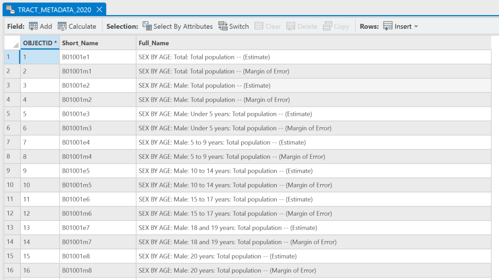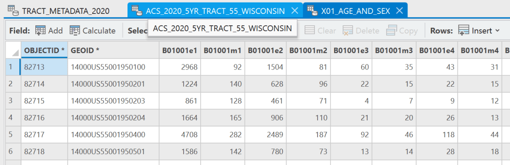 Then in all of the supplement tables, you will see the attributes that you see in the metadata and then GEOID. This GEOID field matches the GEOID_Data field and we will come back to this in a moment.
