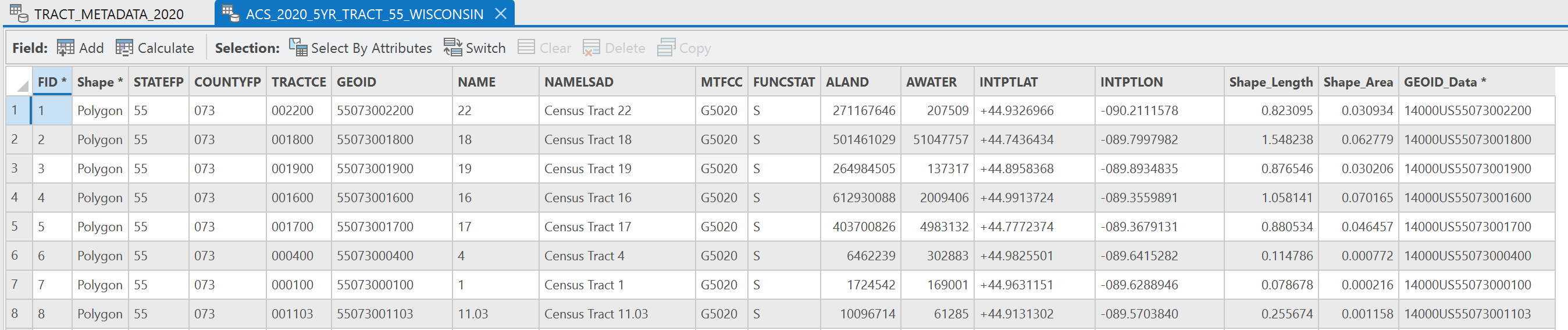 In all of the tables, there are a few key fields. In the Feature Class table, you will see a few identifying fields, the area of the land and water, and the most important field to work with this data GEOID_Data.