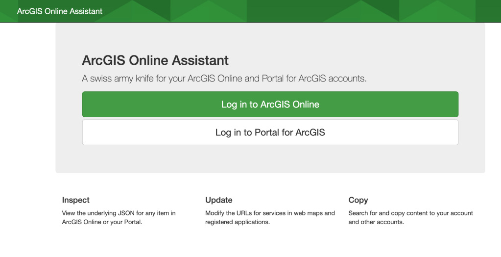 The ArcGIS Online Assistant’s Website is https://ago-assistant.esri.com/