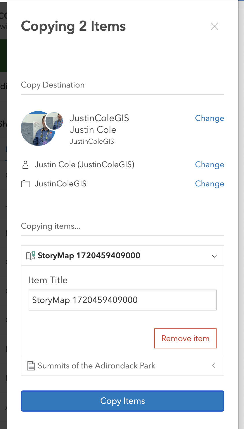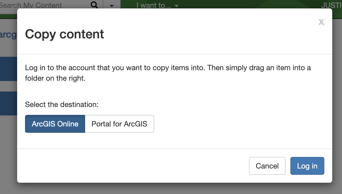 Note: This process only copies webmaps and feature services. It cannot copy StoryMaps and Applications.