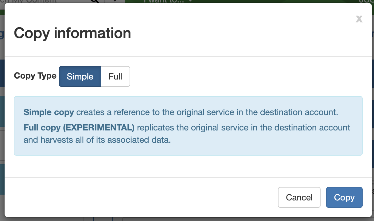 Currently, the full copy is experimental so just make sure it works. When you select it, you will be presented with the option to change the name of the service. Then it will copy and create the services.