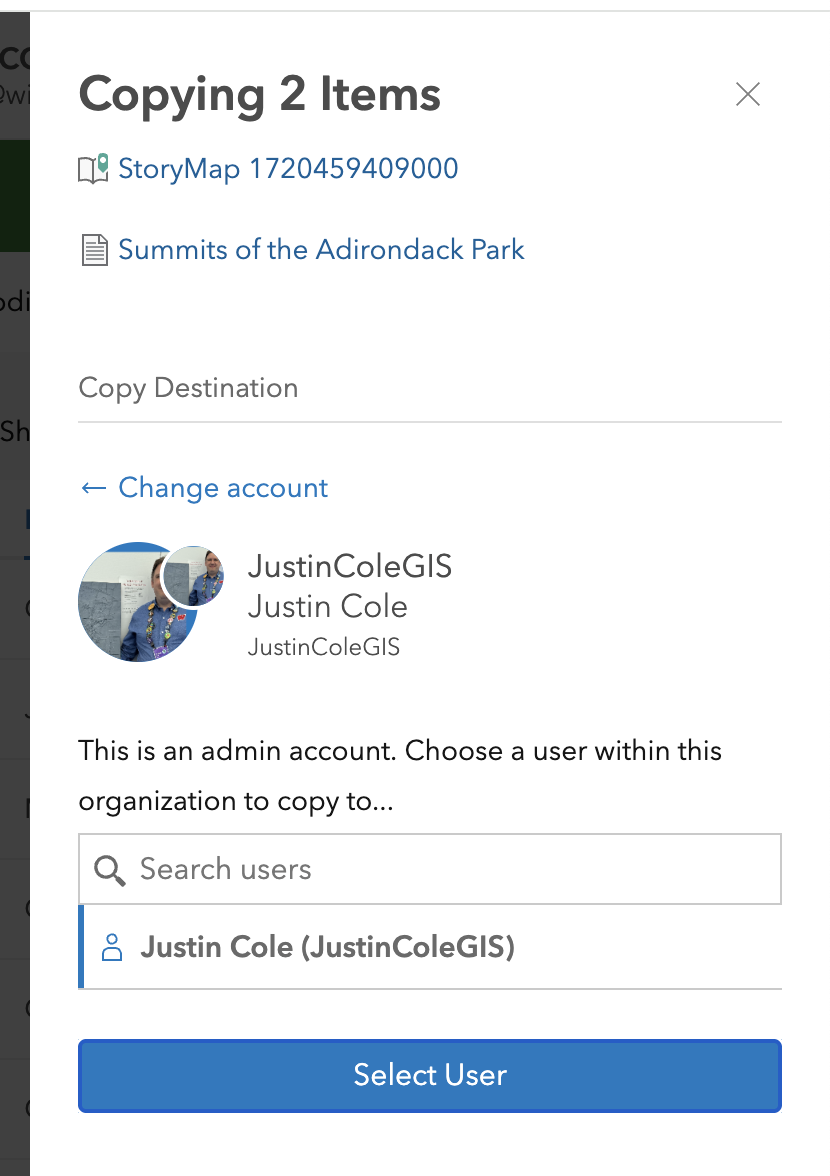 Then it will ask you to pick the user to copy the item. The interesting thing here is if you are the admin of the second organization you can pick a different user. Because your personal account is just you, only your username will appear.